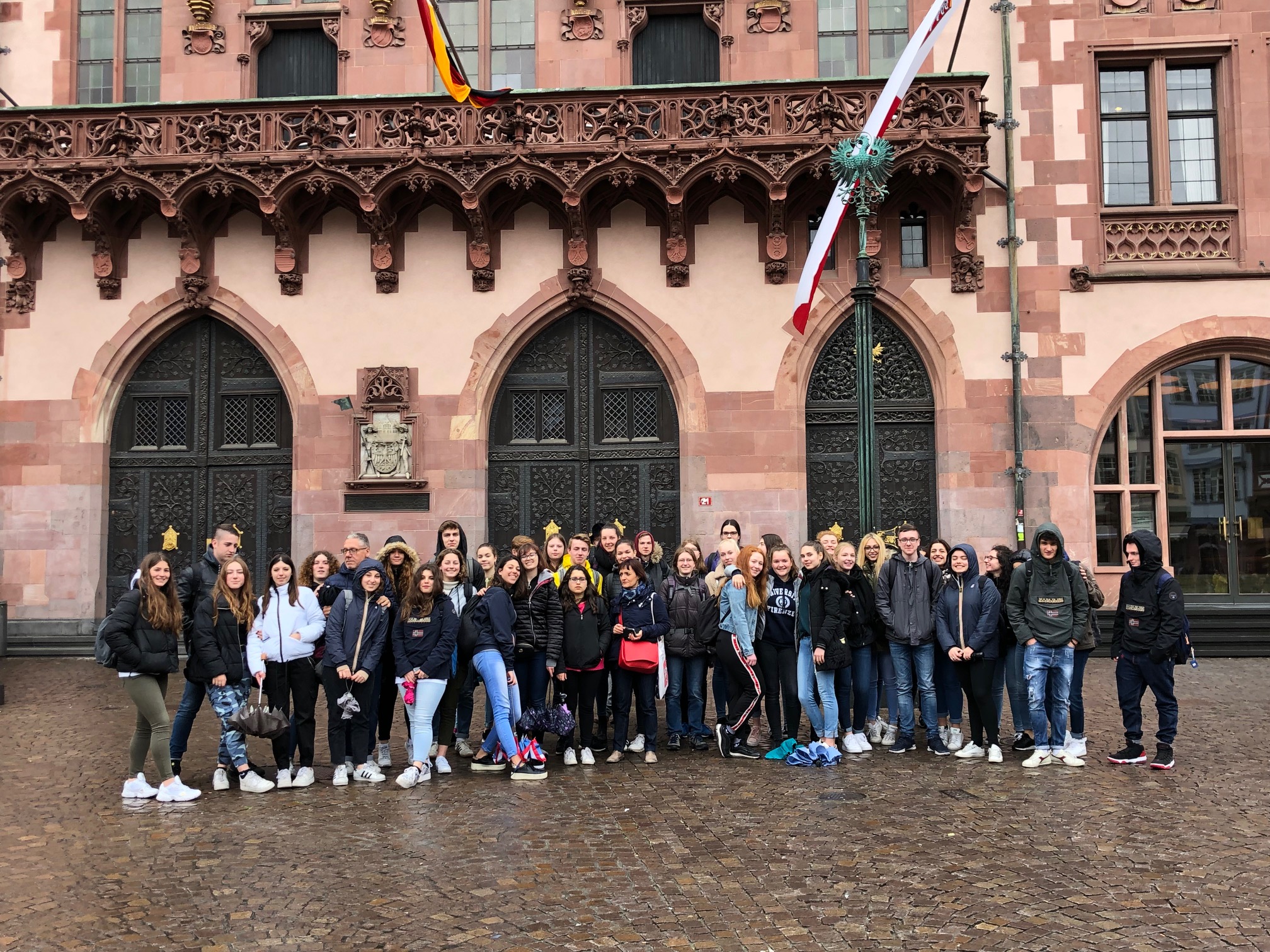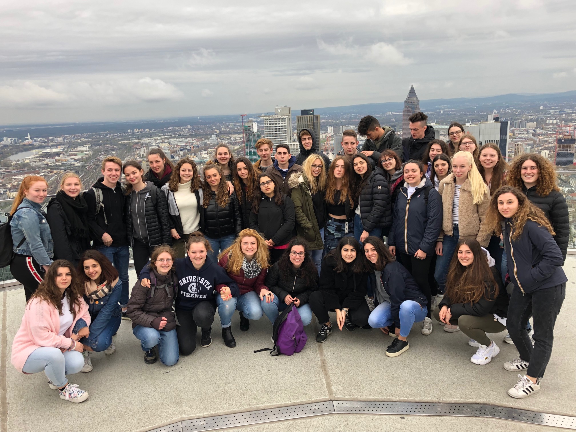 Am Mittwoch, 03.04.2019, ging es dann nach Frankfurt. Wir trafen uns morgens um acht Uhr am Bahnhof in Weiterstadt, um von dort aus per Zug zur Hauptwache in Frankfurt zu fahren. Dort angekommen, war der erste Programmpunkt das Goethehaus. Hier erhielten wir, wieder auf Deutsch und Italienisch getrennt, eine Führung durch das Haus der Familie Goethe und haben vor allem viel zum Leben des Johann Wolfgang von Goethe erfahren. Von dort aus machten wir eine Sightseeing-Tour durch Frankfurt mit anschließenden zwei Stunden Freizeit auf der Zeil. Hiernach stand dann eine eineinhalbstündige Schifffahrt auf dem Main auf dem Programm. Zum Schluss ging es dann noch auf den höchsten betretbaren Punkt Frankfurts, den Main Tower. Natürlich wurde hier vorwiegend die unfassbare Aussicht bewundert, aber auch eine große Anzahl an Fotos aufgenommen. Als dann alle wieder in der Eingangshalle des Towers eintrafen, ging es zusammen wieder per Zug nach Hause. Einige blieben auch noch in Frankfurt.