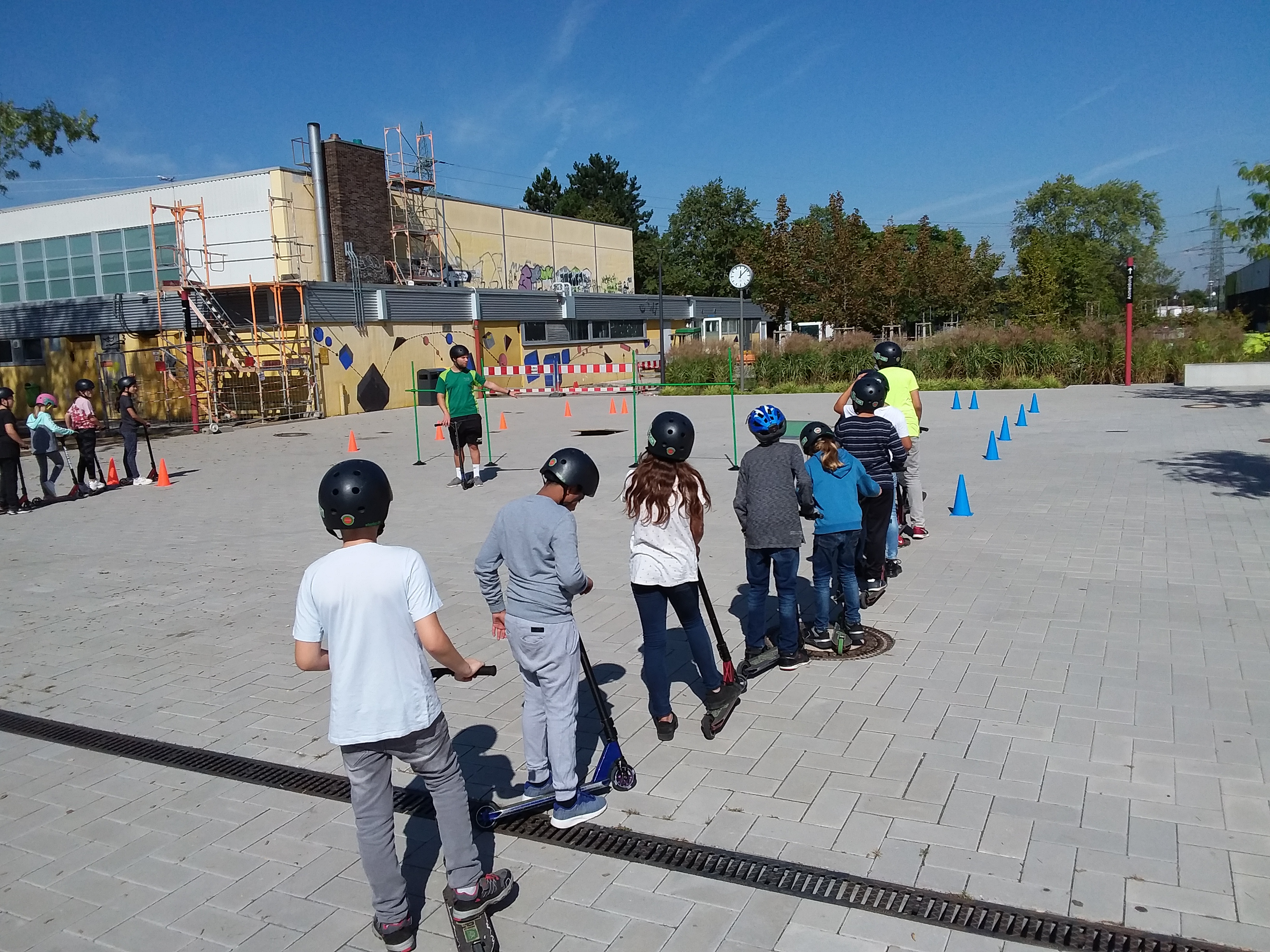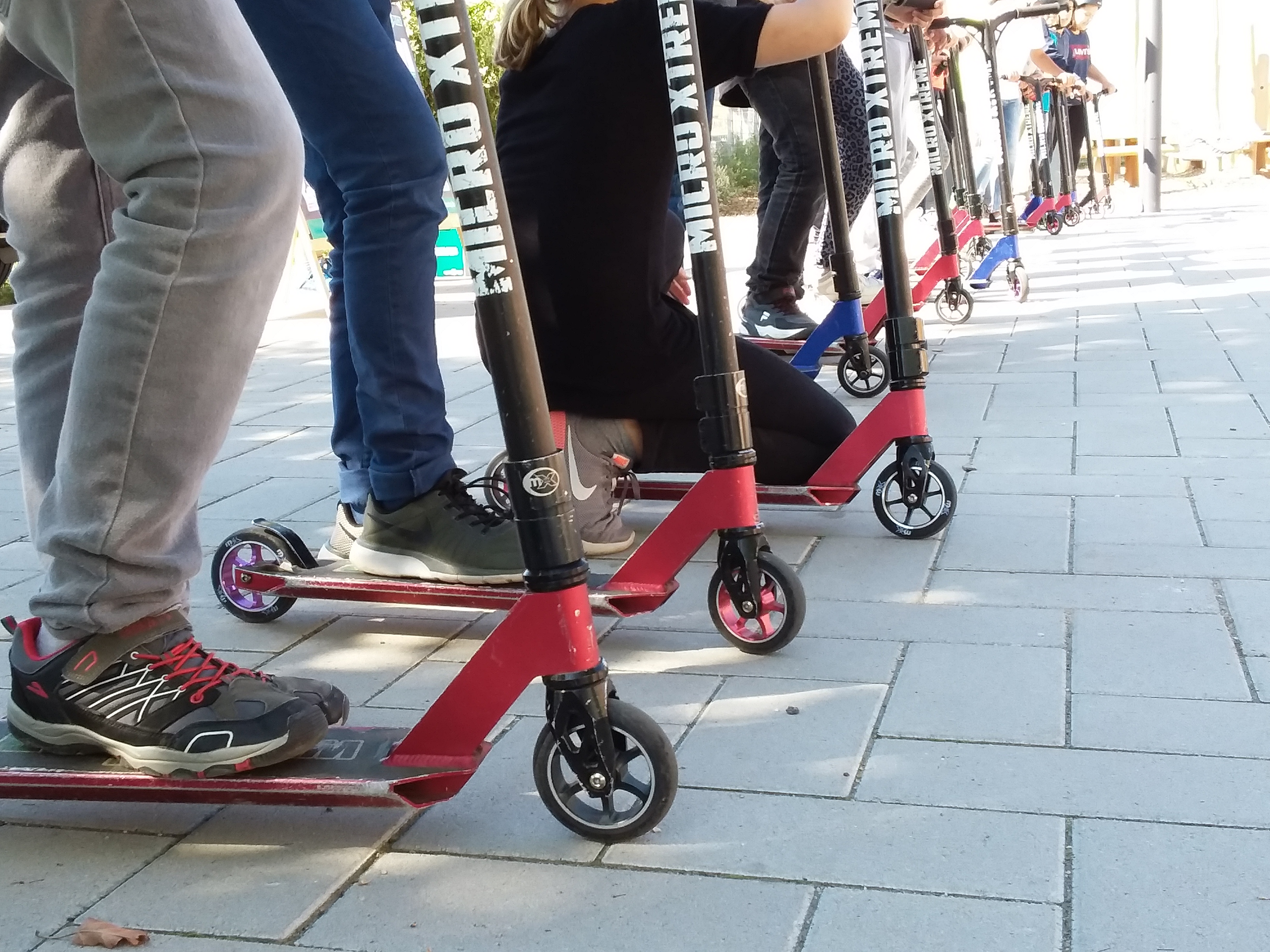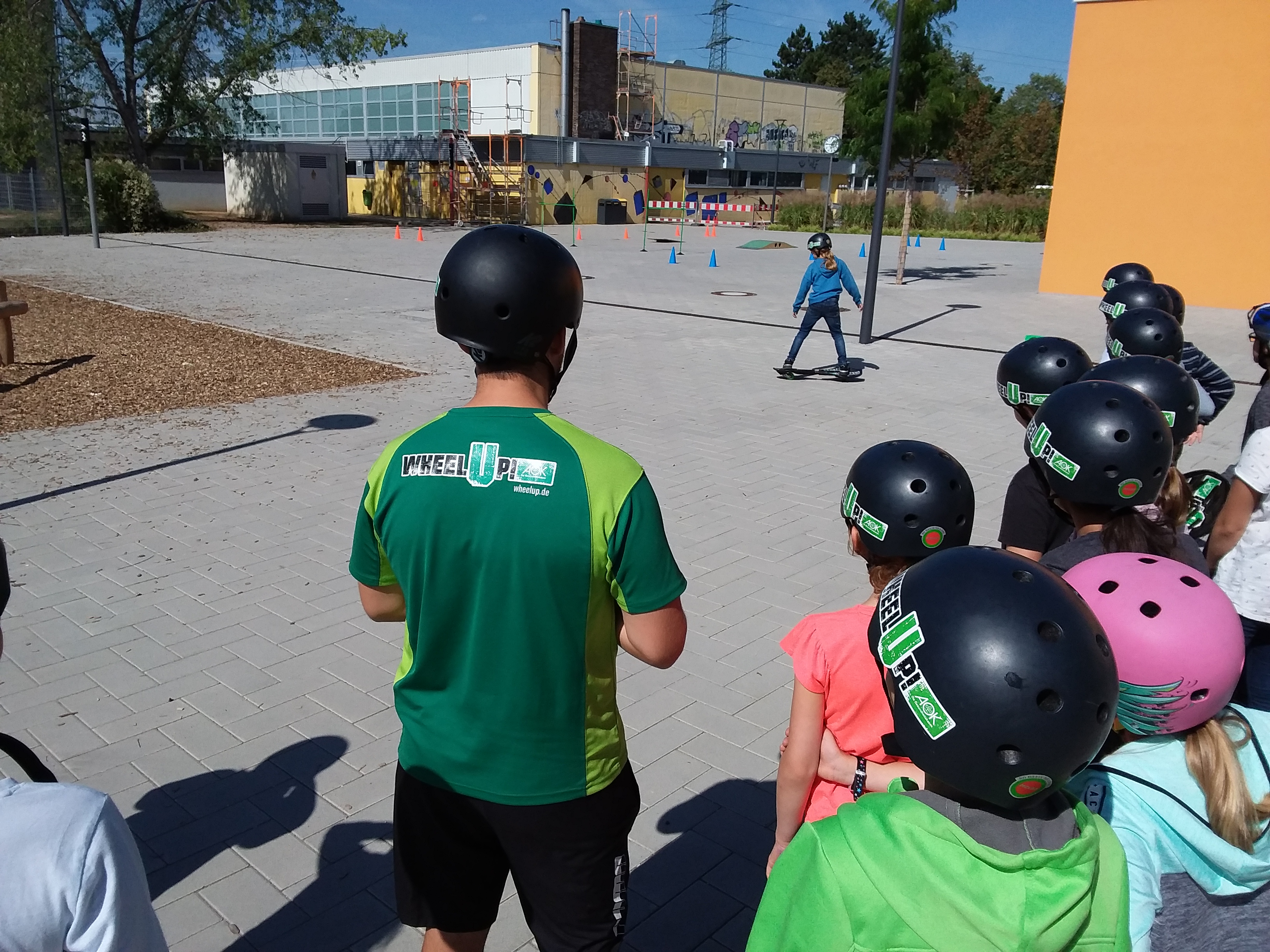 Nach erfolgreicher Instruktion der Lehrkräfte und eifrigem Erproben bestand nachfolgend für interessierte Klassen eine Woche lang die Gelegenheit, im Rahmen ihres Sportunterrichts das Material zu testen und vielfältige, über die „normalen“ Lerninhalte deutlich hinausgehende Bewegungserfahrungen zu sammeln. Begleitet durch die Wheel Up-App existieren diverse Möglichkeiten, um sich Fahrkünste und Tricks mittels digitaler Hilfsmöglichkeiten und Erklärungen anzueignen, was den teilnehmenden Schülerinnen und Schülern umfassend Spaß bereitete.